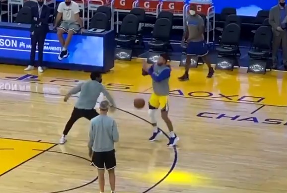 博球00701月05日讯 今天勇士迎来对阵国王的比赛,赛前勇士后卫斯蒂芬-库里与助理教练莱昂德罗-巴博萨在赛前热身时单挑。 库里一番漂亮的