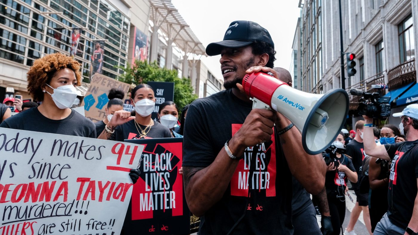 快速比分6月20日讯 奇才后卫布拉德利-比尔今日在华盛顿参加黑人平权运动游行时面对抗议人群发表演讲,谈到了自己遭遇警察威胁恐吓的经历。
